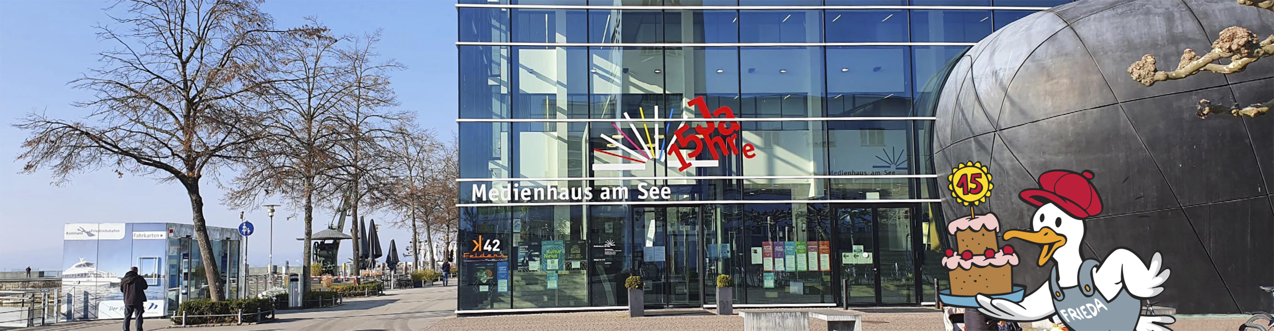 Am 1. März 2007 wurde das Medienhaus am See in Friedrichshafen eröffnet. Einzigartig sind der Standort direkt am Bodensee sowie die markante Architektur des Gebäudes mit dem angebauten Kiesel. Heute nach 15 Jahren und vielen neuen Kapiteln, die im Laufe der Zeit aufgeschlagen wurden, kann man eines mit Sicherheit sagen: Das Medienhaus am See ist eine echte Häfler Erfolgsgeschichte. Es bietet nicht nur vielseitige, multimediale Angebote, Veranstaltungen und Kooperationen, auch die hohe Aufenthaltsqualität mit fantastischen Ausblicken auf den Bodensee sucht wahrlich ihresgleichen. Zur ausgeprägten Willkommenskultur trägt auch das hochqualifizierte Medienhaus-Personal bei. Gebührend gefeiert wurde der Medienhaus-Geburtstag im Rahmen eines bunten Familientages am 26. März 2022. Mit von der Partie waren natürlich auch die bestens gelaunte Lesemöwe Frieda und Clown Dido, der für jedes Kind eine kleine Überraschung bereit hielt.