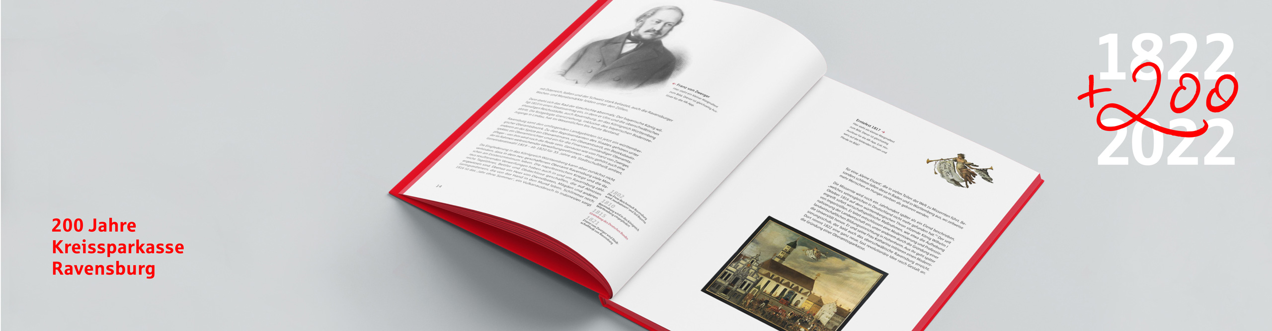 Gegründet 1822 als kleines, in Teilzeit betriebenes Amtsstübchen, hat sich die Kreissparkasse Ravensburg im Laufe der letzten 200 Jahre zur verlässlichen Partnerin in sämtlichen Finanzfragen entwickelt, die mit ihrem Engagement die Region auch weit über das Geschäftliche hinaus prägt. Wie lange 200 Jahre tatsächlich sind, wird besonders deutlich, wenn man das Weltgeschehen betrachtet – vom Start der ersten Eisenbahn über die Erfindungen von Flugzeug und Automobil bis hin zur Deutschen Wiedervereinigung und der Digitalen Revolution.