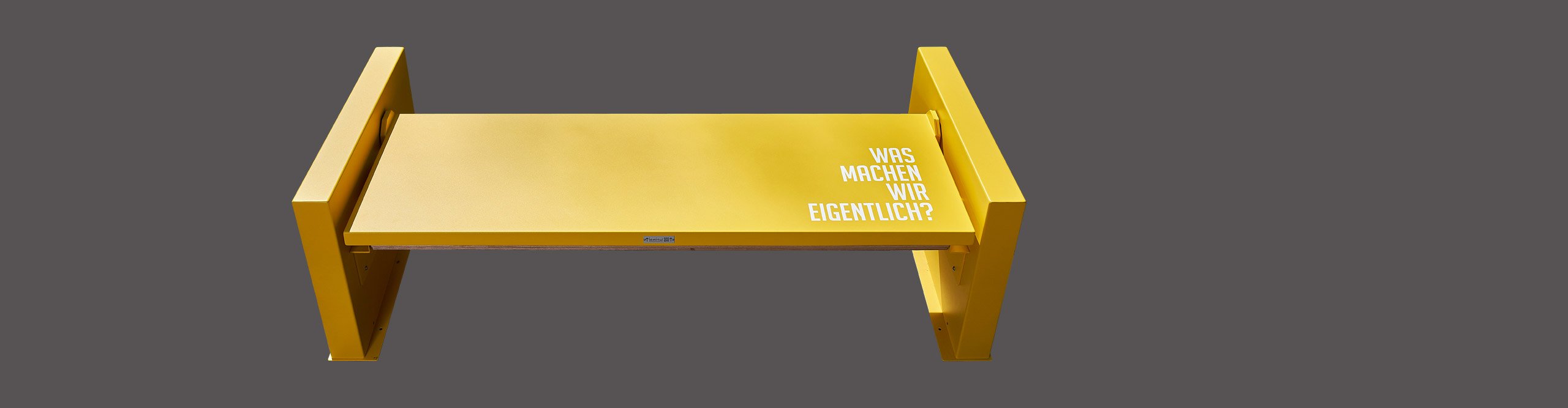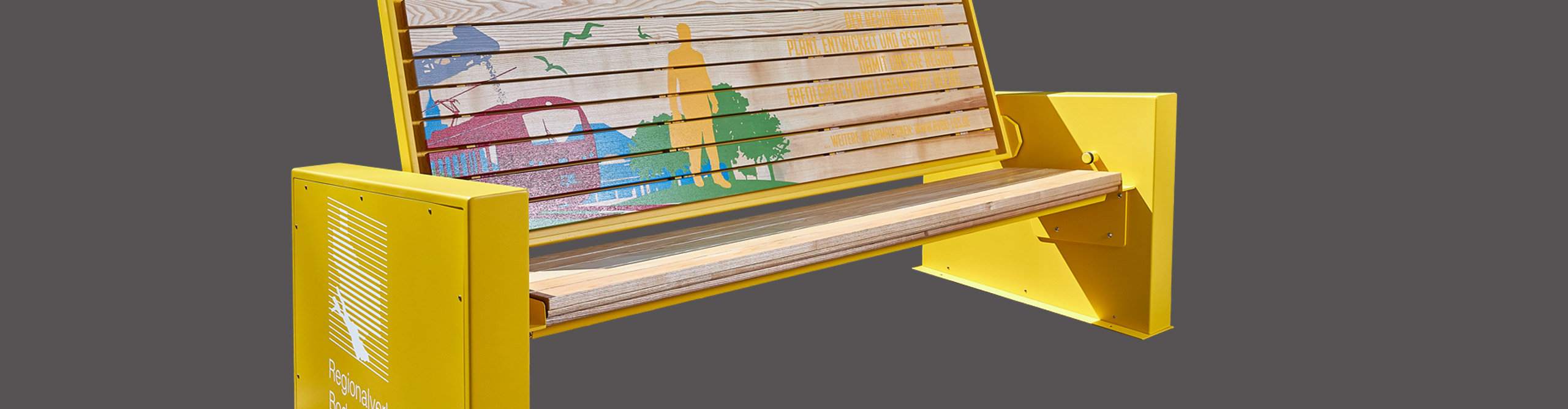 Für die Inszenierung auf der Landesgartenschau haben wir Bänke der bahu Bankmanufaktur eingesetzt. Durch ihre patentierte Klapp-Funktion legt sich die Rückenlehne nach Benutzung der Bank automatisch und sanft über die Sitzfläche. Diese bleibt somit stets trocken. Der fein ausbalancierte Mechanismus macht das Aufklappen kinderleicht. Die Bänke sind farblich, grafisch und typografisch markiert. Auf der Rückseite der Rückenlehne stehen dabei Fragen wie: Wo gibt es geeignete Plätze zum Wohnen und Arbeiten? Wer stopft das Dieselloch? Bauen wir alles zu? Wer braucht schon Kies? Klappt man die Bank auf, erscheinen kurze Antworten mit passender, grafischer Visualisierung. Und wer mehr wissen möchte, kann über einen QR-Code die von uns gestaltete und programmierte Internetseite www.rvbo-lgs.de aufrufen und sich bequem auf der Bank sitzend informieren.