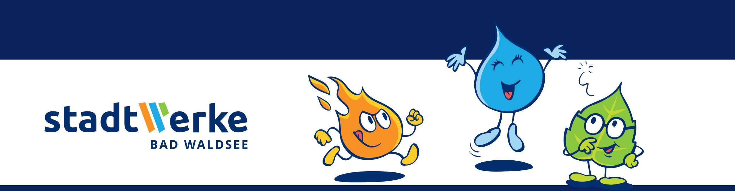 Für die Stadtwerke Bad Waldsee haben wir in einem ersten Schritt drei sympathische Marken-Botschafter entwickelt. Das sind Sammy, Toni und Waldi. Tatkräftig und aktiv, frisch und munter sowie schlau und nachhaltig stehen sie stellvertretend für die drei Tätigkeitsbereiche: Nahwärme, Thermalwasser und Erneuerbare Energien. Auch ihre Namen tragen die drei nicht zufällig. Sie leiten sich von „Stw“ ab, dem Kürzel für Stadtwerke.