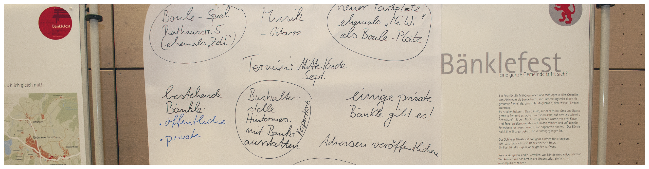 Wir waren beeindruckt, wie engagiert die Schliererinnen und Schlierer an der Entwicklung ihrer Gemeinde mitarbeiten. Und wir staunten nicht schlecht, als Hans Friedrich bei seiner Ergebnispräsentation zum „Schlierer Bänklefest“ aufgrund der enormen Zustimmung zum Projektvorschlag vorschlug, gleich im September – also nur 8 Wochen später! – das erste Schlierer Bänklefest zu veranstalten.