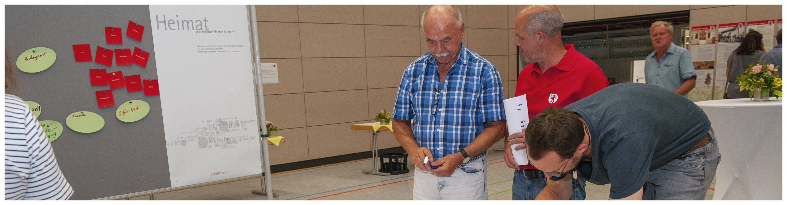Das Förderprojekt findet in engem Austausch mit den Schlierer Bürgerinnen und Bürgern statt, Bürgerbeteiligung wird hier besonders großgeschrieben. An diesem Abend Anfang Juli konnten die Bürgerinnen und Bürger daher an verschiedenen „Schaffinseln“ mitwirken, sich über ihr Verständnis von „Heimat“ austauschen, sich mit dem oberschwäbischen Dialekt befassen oder typisch oberschwäbische Gerichte sammeln. Außerdem waren die Schliererinnen und Schlierer dazu eingeladen, offen Ideen zu sammeln, welche Maßnahmen im Spannungsfeld von Digitalisierung und Heimat die Zusammengehörigkeit innerhalb der vielen Teilorte und Weiler fördern und ein „Schlier-Gefühl“ bewirken könnten. Die Oberschwaben Bernhard Bitterwolf (Heimatforscher, Moderator, Musiker und vieles mehr) und Uli Boettcher – wer kennt ihn nicht? – moderierten den Abend sensationell und sorgten mit viel Humor und oberschwäbischem Charme für die passende Atmosphäre in der Wetzisreuter Festhalle. Die Band Papirossi um Suso Engelhardt nahm ihre Zuhörerinnen und Zuhörer immer wieder mit auf eine musikalische Reise rund um die Welt.