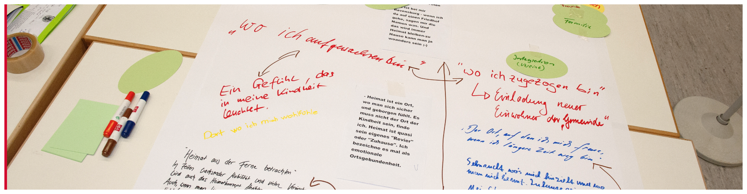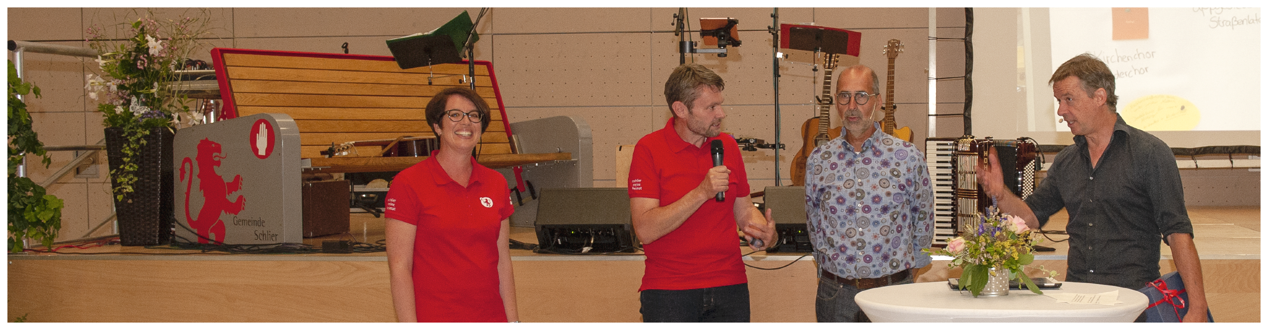Gestalterisch war der Schlierer Heimatabend ganz im Corporate Design der Gemeinde Schlier gehalten. Auch die Sympathiefigur Konrad, der Schlierer Löwe, wurde selbstverständlich eingesetzt. Die Wortwolke, die normalerweise die Teilorte und Weiler der Gemeinde Schlier abbildet, wurde thematisch an die neun Schaffinseln angepasst. So diente sie, abgedruckt auf Plakaten an den Schaffinsel-Tischen, als kleine Einstimmung für die Teilnehmerinnen und Teilnehmer. Ein kleines Highlight waren die fairtrade Polo-Shirts, die das Orga-Team des Heimatabends trug: im Schlierer Rot, mit Logo, Löwe und dem Hashtag #schliermeineheimat auf Brust und Ärmel.