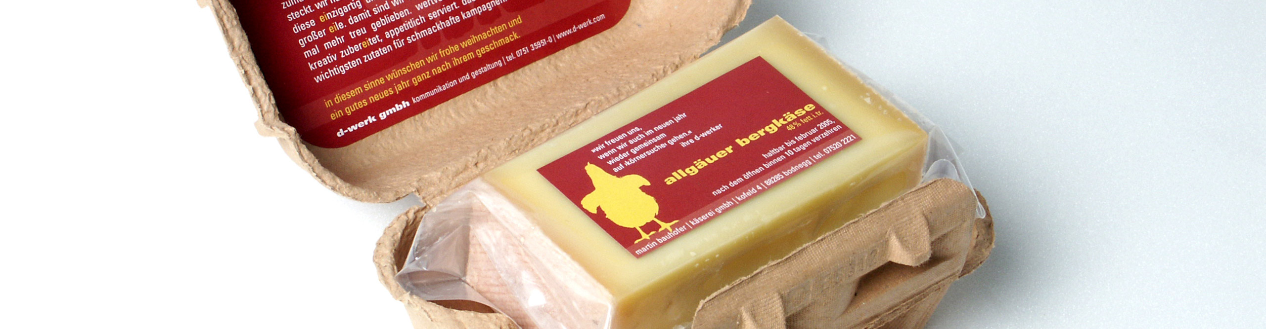 …wir finden, das ist Käse! sehr geehrte kunden, werte partner, liebe freunde, mal ehrlich gesagt, was würden sie zu einem karton frischer landeier als weihnachtsgeschenk sagen? ist doch käse! eben, das haben wir uns auch gesagt. zumal in diesem geschenk schon genügend ei drinsteckt. wir haben uns eifrig gedanken gemacht. haben diese einzigartig umgesetzt. und das ganze unter großer eile. damit sind wir unserer philosophie einmal mehr treu geblieben. wertvolle inhaltsstoffe, kreativ zubereitet, appetitlich serviert. das sind die wichtigsten zutaten für schmackhafte kampagnen.