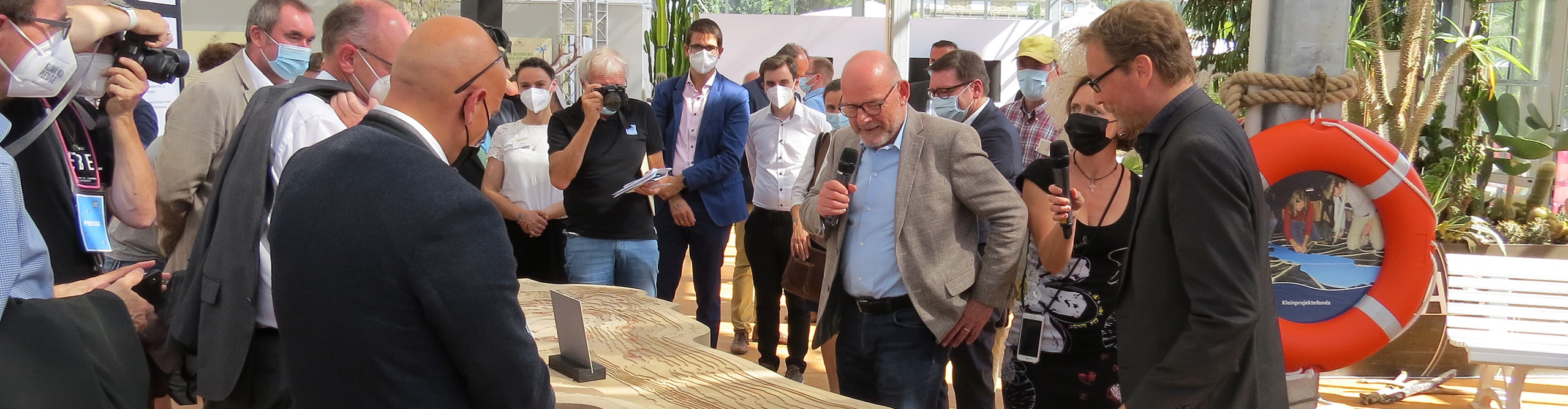 Die Ausstellung umfasst unter anderem eine digitale Präsentation mit 6 Schwerpunktthemen und Möglichkeiten zur Förderung von grenzüberschreitenden Projekten sowie die nachhaltige Einbindung von Modulen des bestehenden Messestands und von Elementen der Stallwächterparty. Besonderer Eyecatcher der Ausstellung ist das große Bodenseemodell aus Holz, das die einzigartige Datensammlung des „Projekts Tiefenschärfe“ zur Neuvermessung des Bodensees, seines Grunds und seiner Ufer beeindruckend visualisiert.
