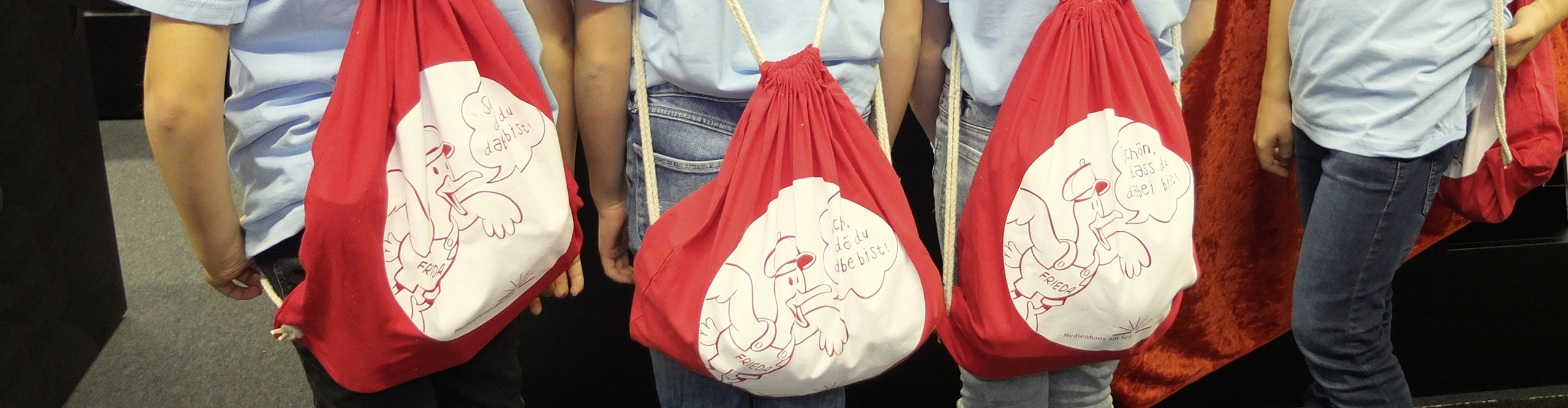 Mit Frieda unterwegs! Zur Auftaktveranstaltung gab es ein kleines Paket für die Schüler. Im Turnbeutel fanden sie ein T-Shirt, Luftballon und die Postkarte, auf der sie ihren Lesetipp abgeben konnten