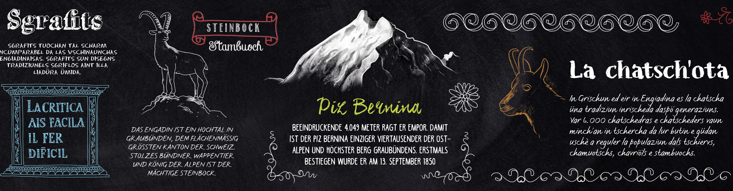 Unser Part bei diesem Vorzeigeprojekt im Kanton Graubünden war die spezielle Gestaltung von Wänden innerhalb von Shop und Bistro. Dafür haben wir verschiedene Engadiner Spezialitäten recherchiert und in Form von Illustrationen visualisiert – von der „Tuorta da nuschs“, der berühmten Engadiner Nusstorte, über das charakteristische Sgraffito, die Malereien an den typischen Engadiner Häusern bis hin zur einzigartigen dreifachen Wasserscheide Europas, von der aus das kostbare Nass in drei verschiedene Weltmeere fließt. Die Illustrationen wurden im markanten Kreidetafel-Stil erstellt und farblich akzentuiert. Texte wurden von uns verfasst, auf die wesentlichen Passagen reduziert und in deutsch sowie in rätoromanisch, der vierten Amtssprache in der Schweiz, dargestellt. Diese auf der Wand illustrierten und beschriebenen Engadiner Spezialitäten gibt es auch zum Mitnehmen in Form einer kleinen Broschüre. Ebenfalls aus unserer Feder stammt die Wortmarke „Spuntino“, der Name des angegliederten Bistros. Gleichermaßen elegant wir plakativ ziert er dort die Wandflächen. Auch für die Markierung der Außen-Fensterflächen von Shop und Bistro zeichnen wir verantwortlich. Hier wurde das Thema „Genuss“ aufgegriffen und illustrativ visualisiert.