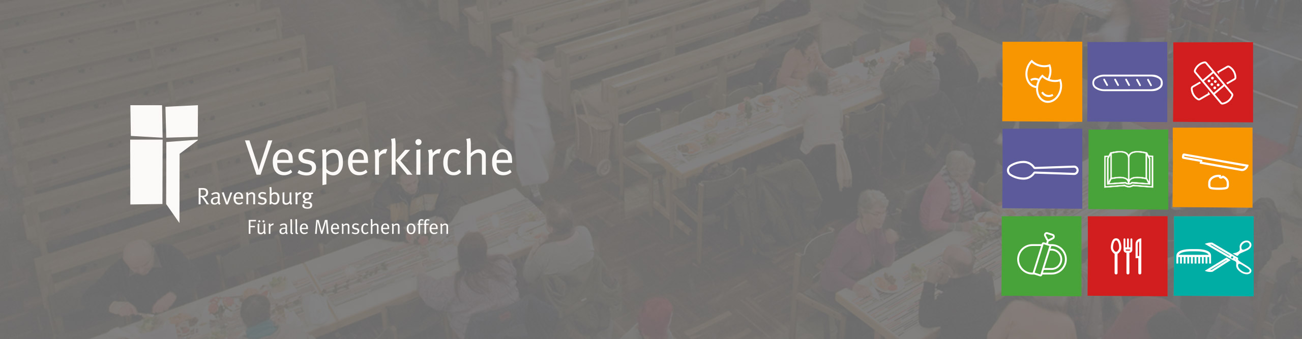 Miteinander essen, reden, leben – dieses Motto gilt für die Vesperkirche, die immer Anfang des Jahres, für drei Wochen in der evangelischen Stadtkirche in Ravensburg oder in Weingarten stattfindet. Während dieser Zeit wird die Kirche zum Lebensraum, zu einem Ort, um Kraft zu tanken und innezuhalten, einem Ort, der für alle Menschen offen ist – zum gemeinsamen Mittagessen, für Besuche der kostenlosen Kulturveranstaltungen oder auch für die Inanspruchnahme kostenloser medizinischer Versorgung und sonstiger nützlichen Dienstleistungen. Auf Basis eines von uns entwickelten umfassenden Konzeptes wurde das Logo gestaltet, der Claim und das Corporate Design entwickelt. Das Logo stellt dabei eine sich öffnende Kirchenpforte dar mit dem Kreuz in der Mitte oder auch zwei Menschen, die im Zeichen des Kreuzes in Dialog miteinander treten. Prägend bei der Gestaltung sind die in farbige Quadrate gefassten Piktogramme, welche die Vielfalt des Angebotes der Vesperkirche visualisieren und eine Bewerbung der einzelnen Angebote ermöglicht.